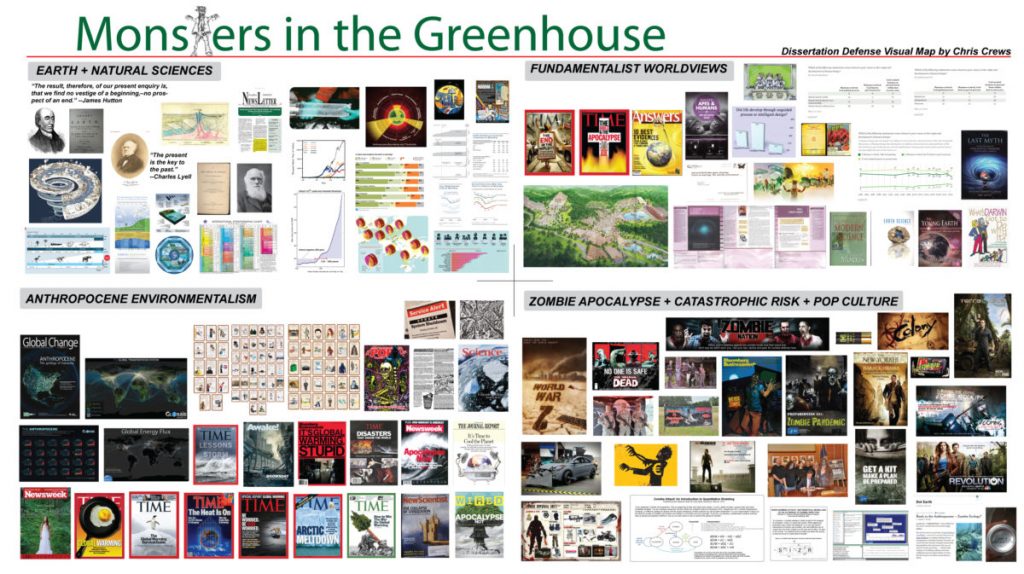 Come hell or high water tomorrow, which in New York these days it’s hard to know which is more likely, my PhD dissertation proposal defense will be over. I’m expecting it to be successful. However, I was not able to use some of the multimedia and visuals I had hoped to be able to use in the defense itself. But that wouldn’t stop me. If technology is the problem, so be it. And so I went back to old school-ish methods–the printed, large-format visual bricolage. Viola! So in all its glory, here is my attempt to compress some of my project, which is looking at the intersections of religion, science, popular culture and environmental politics in the Anthropocene, into one large visual map. Apologies if some of the smaller sections are harder to read. The full original is 72″ x 48″.